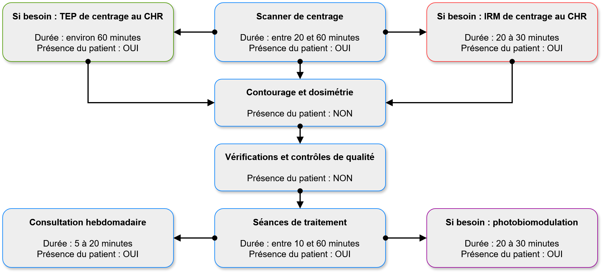 Lors de la première consultation, le radiothérapeute informe le patient sur son état de santé et le traitement envisagé. Ensuite, pendant toute la durée de la radiothérapie, il reçoit le patient en consultation hebdomadaire, assurée par le médecin référent ou, en cas d’absence, par un autre médecin du service.